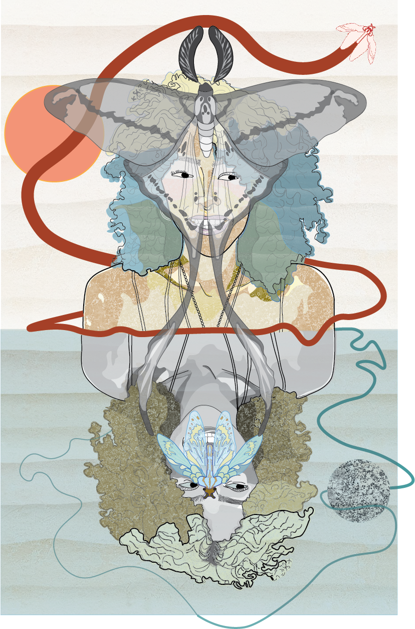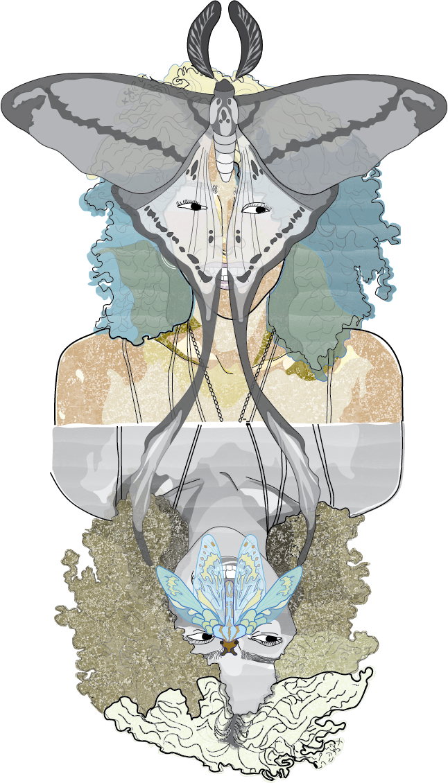 Using Adobe Illustrator, I created a self-portrait that blends elements of nature with symbolism to reflect personal growth and transformation. The background, as well as my face and body, are complimented with natural elements, such as moths, which represent letting go of the past. The moths hold particular meaning as the only insect I feel connected to. The portrait is abstract, with my face presented in a surrealist style, yet I ensured both my features, and the natural elements maintain a sense of realism to convey the journey of self-discovery.